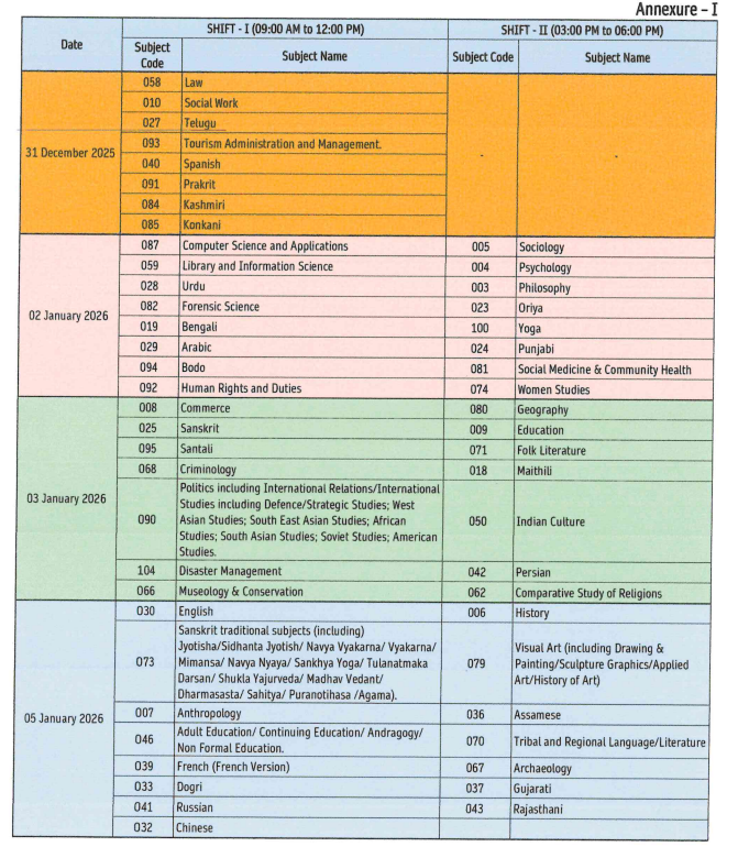 | Jan 5, 2026 | Anthropology (007), Adult Education/Continuing Education etc. (046), French (039), Dogri (033), Russian (041), Chinese (032) | Assamese (036), Tribal and Regional Language/Literature (070), Archaeology (067), Gujarati (037), Rajasthani (043) |