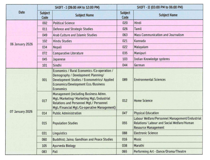 | Jan 6, 2026 | Political Science (002), Defence and Strategic Studies (011), Arab Culture and Islamic Studies (049), Nepali (034), Comparative Literature (072), Japanese (045), Sindhi (101), Economics/Rural Economics etc. (001), Management (017), Public Administration (014), Population Studies (015) | Hindi (020), Tamil (026), Mass Communication and Journalism (063), Kannada (021), Malayalam (022), Manipuri (035), Indian Knowledge Systems (103), German (044), Environmental Sciences (089), Home Science (012), Physical Education (047), Labour Welfare/Personnel Management etc. (055) |